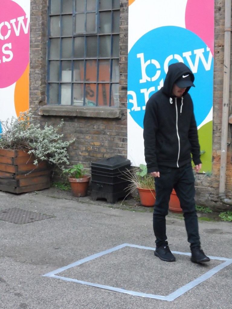I positioned this performance in the courtyard of the gallery as there was a tight ally way in which the audience would have to walk through to see the other performer. This meant that they were forced into the performance, having to interact and question the movements within the confined box. The actions being made were exhaustive and repetitive which references an everyday activity. Placing this into a small confined space made the performance rhythmical in the performers movements, which isolated and ‘othered’ the performer from the audience. The dark clothing and hood/hat made the artist into a dark protagonist which created a contrast between the audience and the performer aliening him from them. This was to draw the audience in, to question the identity of the figure but the audience remained separated by the box, almost like it was a physical wall between them and the performer.