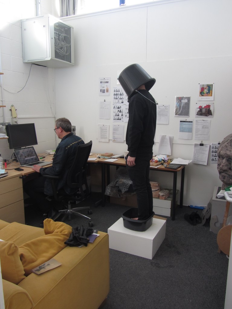 This performance was a parody of one of John Atkin’s artworks, who is a well-known artist and Loughborough University tutor. The performance was placed in his office to inhabit his private space and also an official environment. It was a comment on traditional and historical forms of sculpture raising myself up on a plinth linking to high art and classical Greek Sculptures. The use of props were in reference to what materials and objects he uses for his own artist practice and also add an element of humour to the work. The performance was a long in duration to give the illusion of the performer actually being a sculpture and also transmit to the spectators an element of mystery of who is the performer and how they are able to remain in a static position. The audience who attended felt obligated to stay in the space as it was performed in an authoritative space so they were forced into staying in this environment.