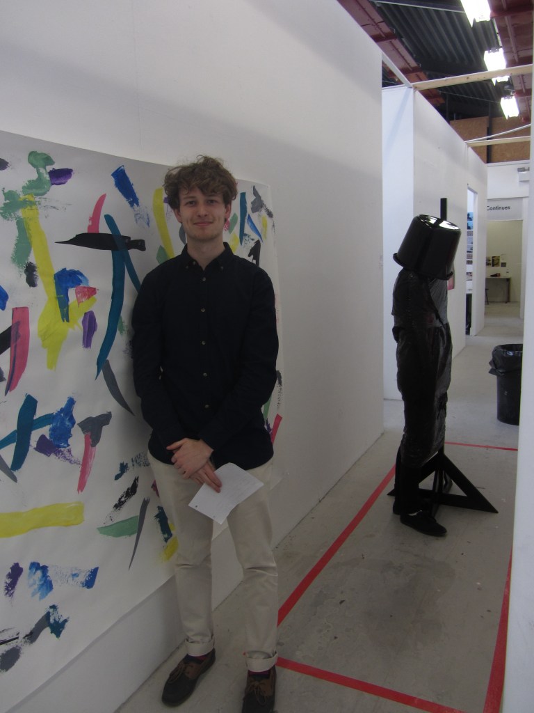 For this performance I inhabited a busy corridor in the Fine Art building at Loughborough University. I glossed my body in complete black and obscured my face with a bucket to allow the audience to feel comfortable engaging with the performance and also allow myself, as the performer, to become a sculptural form. I instructed a peer to act as a curator to say the line “Sorry, the artwork is delicate, please remove your socks and please do not step in the box.” I marked out the box to push the spectators to press their body against the wall. This makes the audience have to work to see the artwork and truly experience the performance. The spectators have to also conform to the structures of the gallery setting.